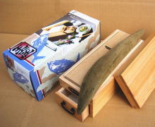 1, 鰹節の皮面の方(表面がざらついている部分)を前にして、後ろ半分を手で押さえてカンナに鰹節を当て、押しながら削ります。(注意、カンナの刃には充分お気をつけください)